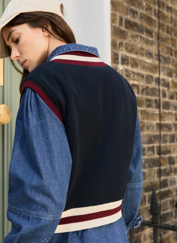 Put the fun into layering with our Leighton V‑Neck Knitted Tank. This sleeveless jumper in organic cotton is tipped with stripes in cream and Burgundy for a subtle, retro‑inspired sporting look. Cool worn on its own with jeans or joggers, it’s also roomy enough to style with a simple tee underneath. Our favourite way to wear it? Over a crisp shirt and tailored trousers.