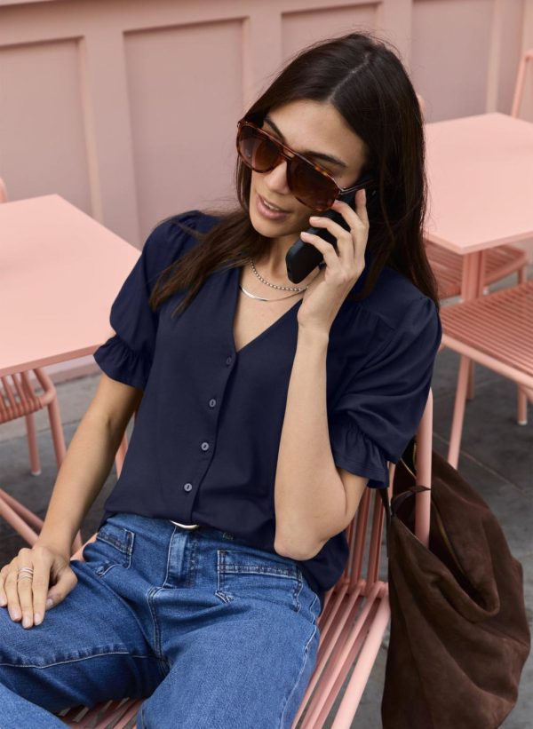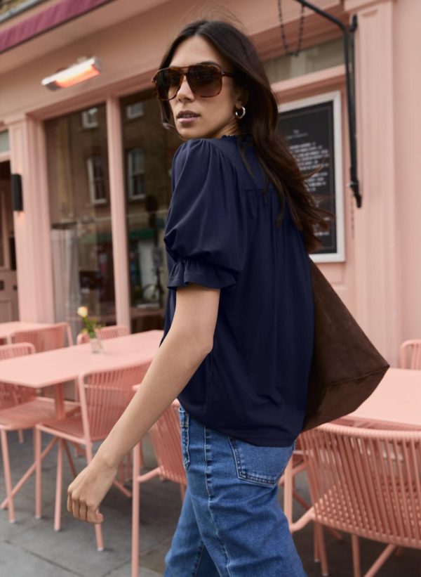 Our Noa Short Sleeve Blouse is a firm customer favourite, and now it’s available in Classic Navy. Cut for comfort from soft and stretchy jersey, it features a pretty ruffled collar and short sleeves with elasticated cuffs. Relaxed on the body, it’s an easy style to elevate jeans on the weekend, or to throw on for work with a pair of tailored trousers and earrings.